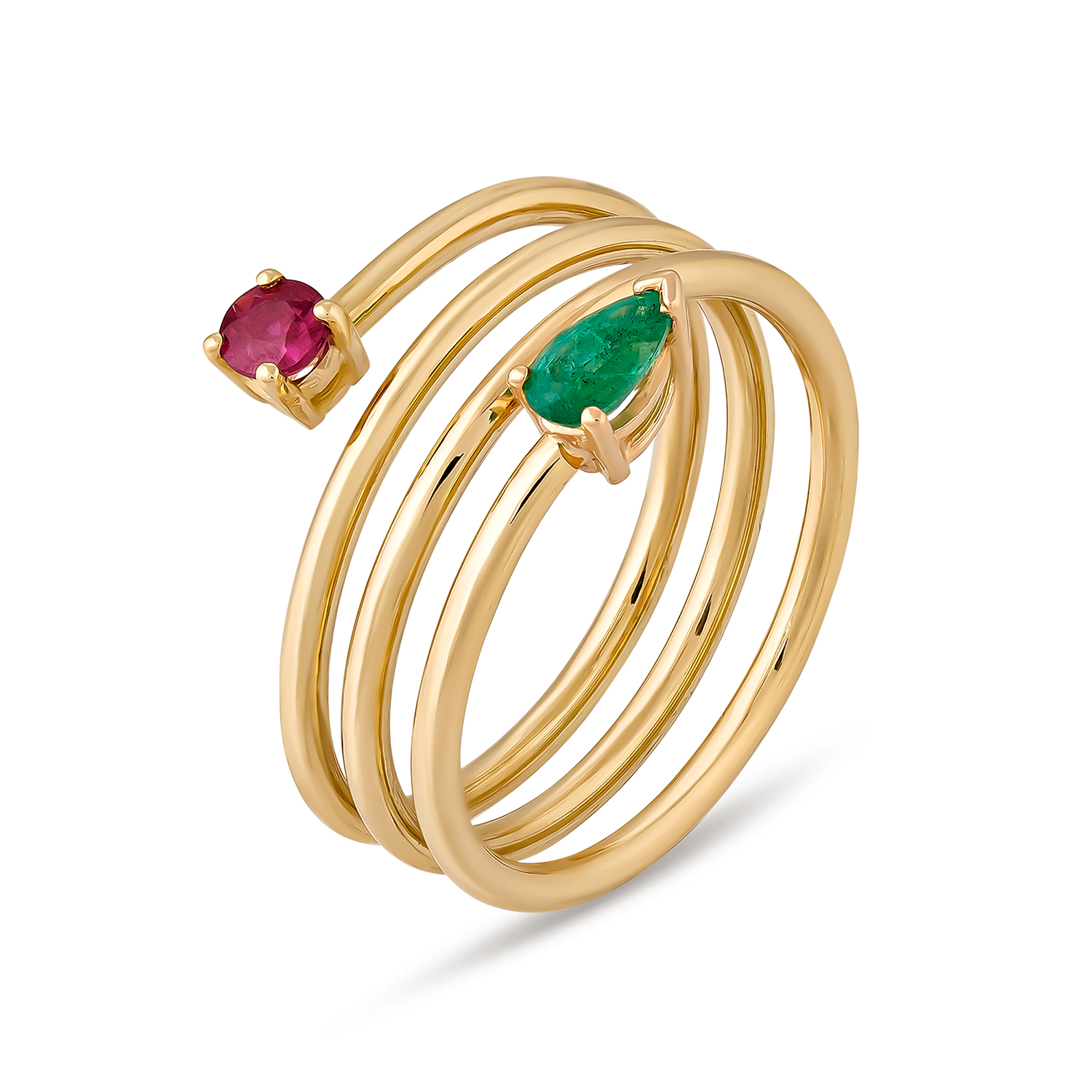 Anillo de tres vueltas en oro amarillo de 1ª Ley con una esmeralda talla pera (0,21 ct) y un rubí talla redonda (0,14 ct).