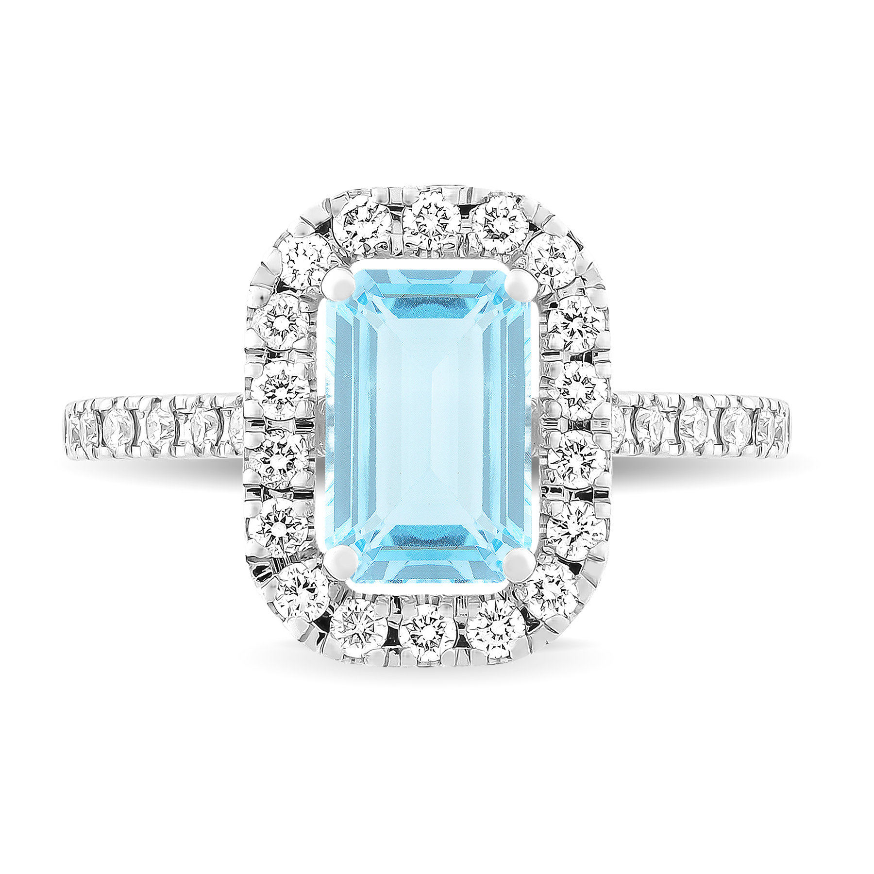 Anillo de oro blanco de 1ª Ley de 18 quilates con una aguamarina central talla esmeralda (0,88 ct aproximado) y diamantes talla brillante alrededor y en el brazo (0,39 ct).