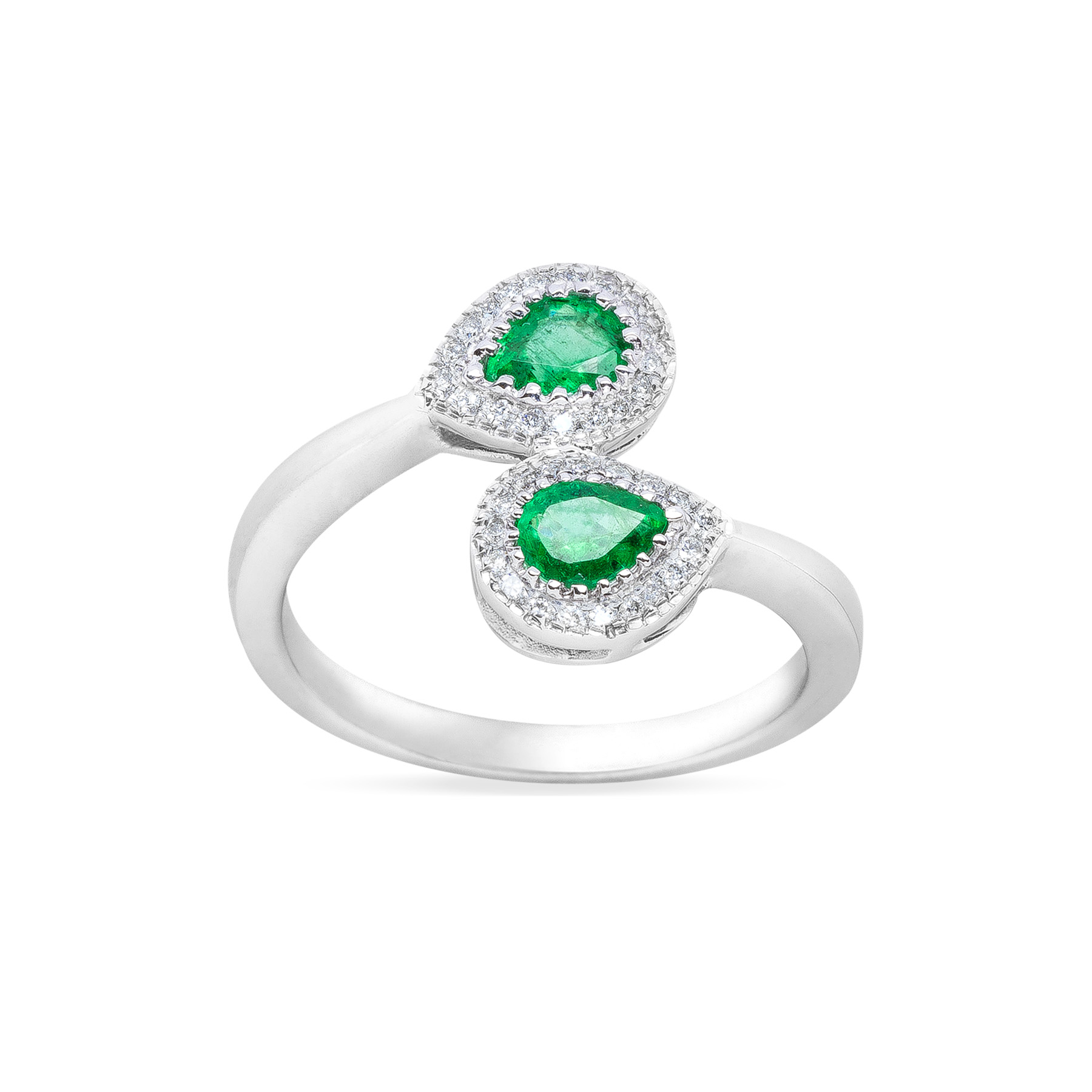 Anillo de oro blanco de 1ª Ley estilo tú y yo con dos esmeraldas talla pera (0,58 ct aproximado) y diamantes talla brillante (0,14 ct).