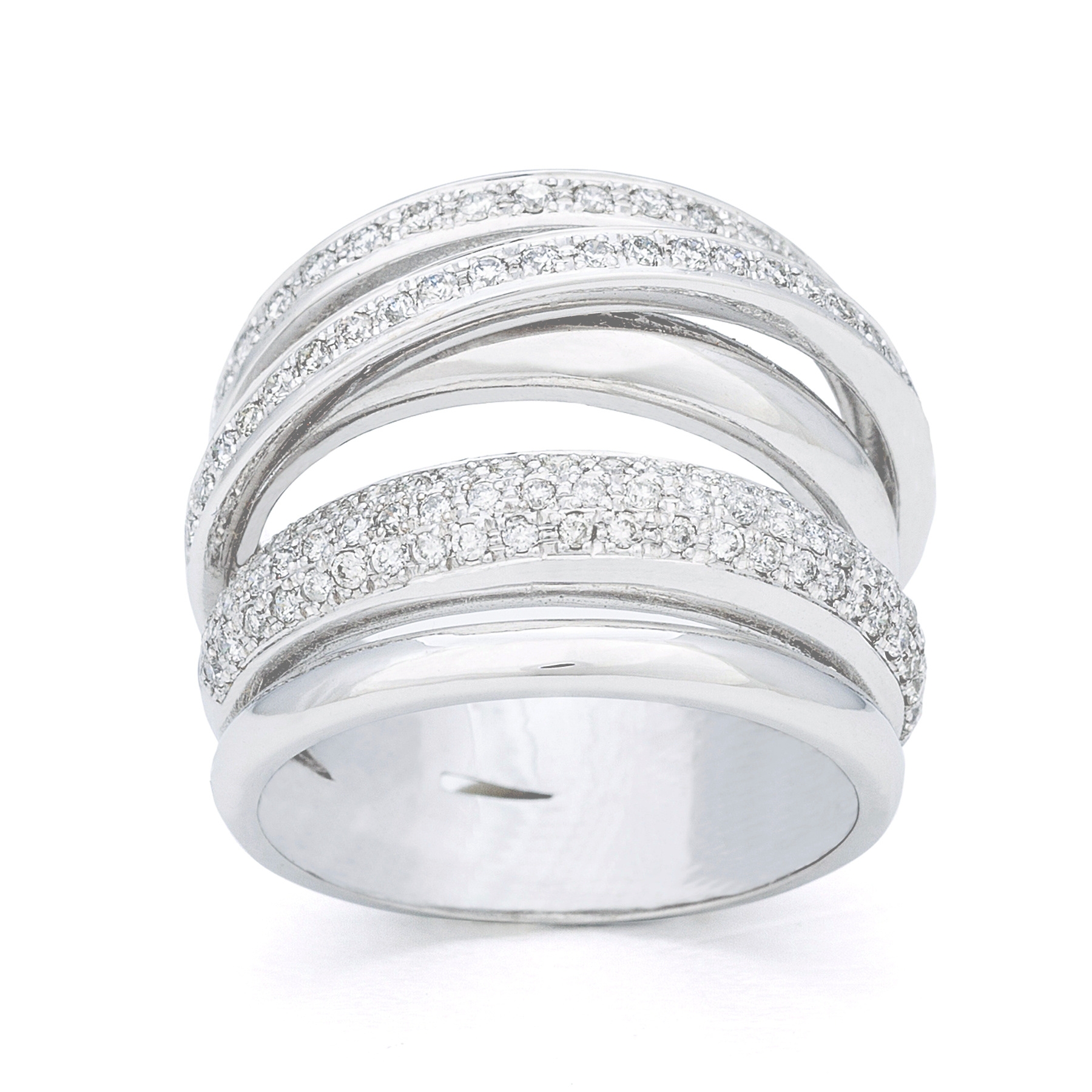 Anillo de oro blanco de 1ª Ley de 18 quilates compuesto por cinco aros que entrelazan aros lisos y de brillantes.