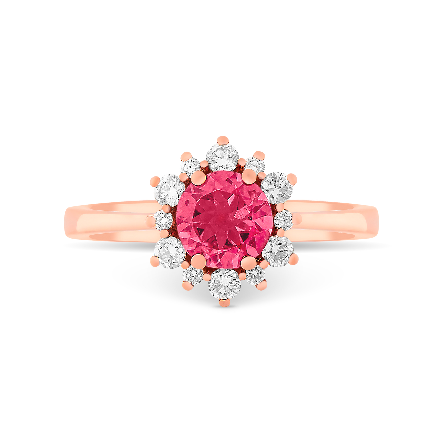 Anillo de oro rosa de 1ª Ley con turmalina rosa central talla redonda (0,40 ct aproximado) y diamantes alrededor (0,20 ct).