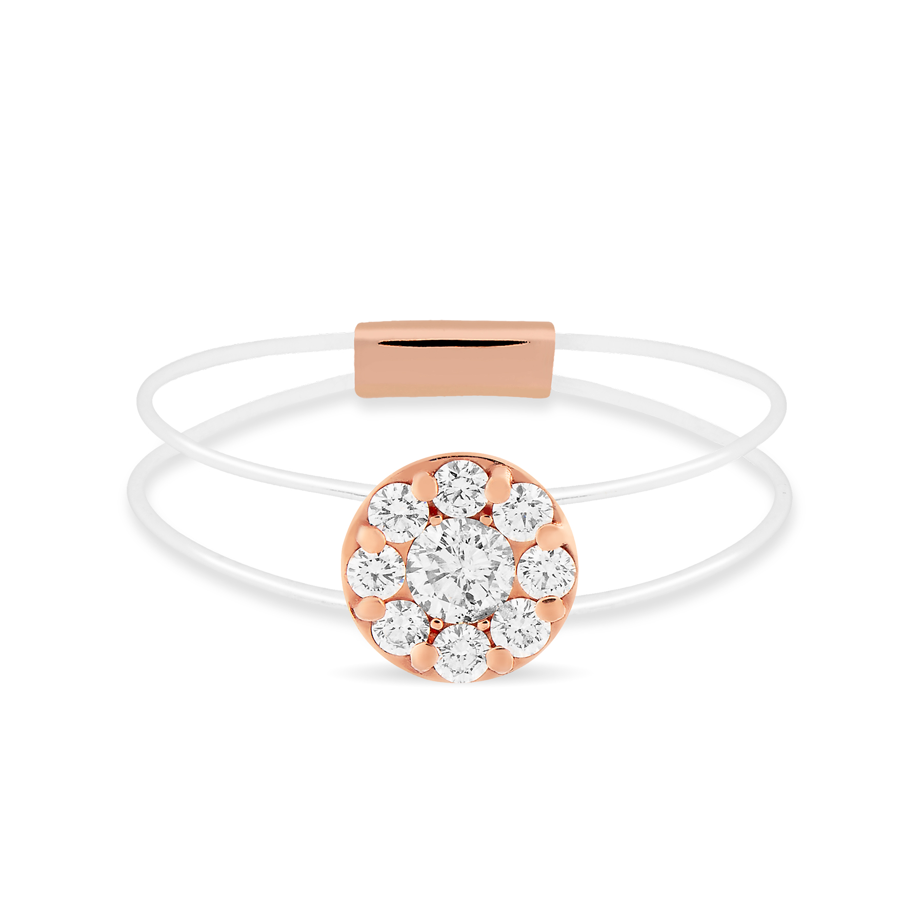 Anillo de oro rosa de 1ª Ley con motivo circular de diamantes y brazo invisible.