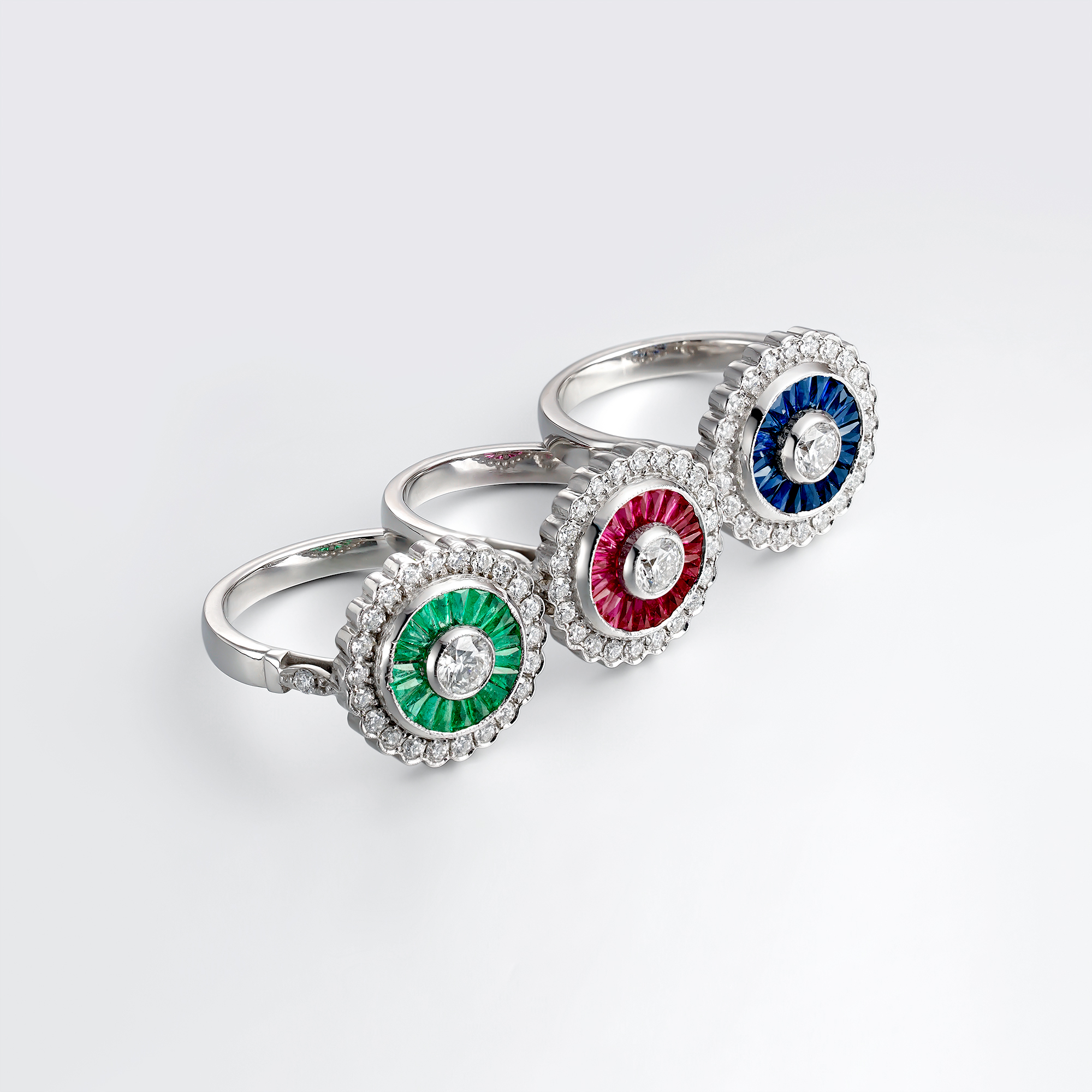 Anillo ojo de perdiz en oro blanco de 1ª Ley con diseño art-decó compuesto por un diamante central de 0,20 ct rodeado por rosetón de rubíes calibrados (0,62 ct aproximado) y diamantes (0,30 ct).