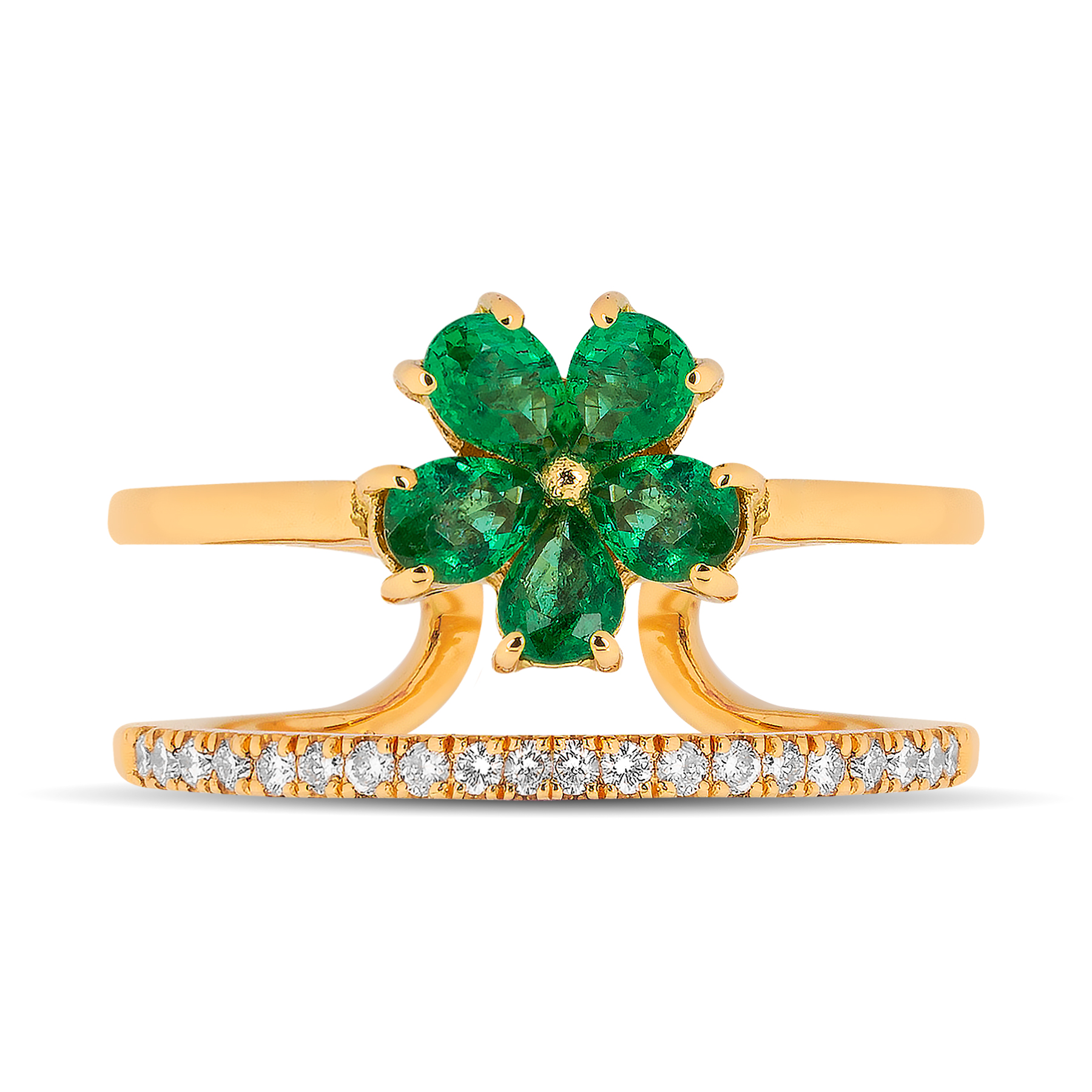 Anillo doble de oro amarillo de 1ª Ley de 18 quilates compuesto por flor de esmeraldas talla pera (0,99 ct aproximado) y diamantes talla brillante (0,15 ct).