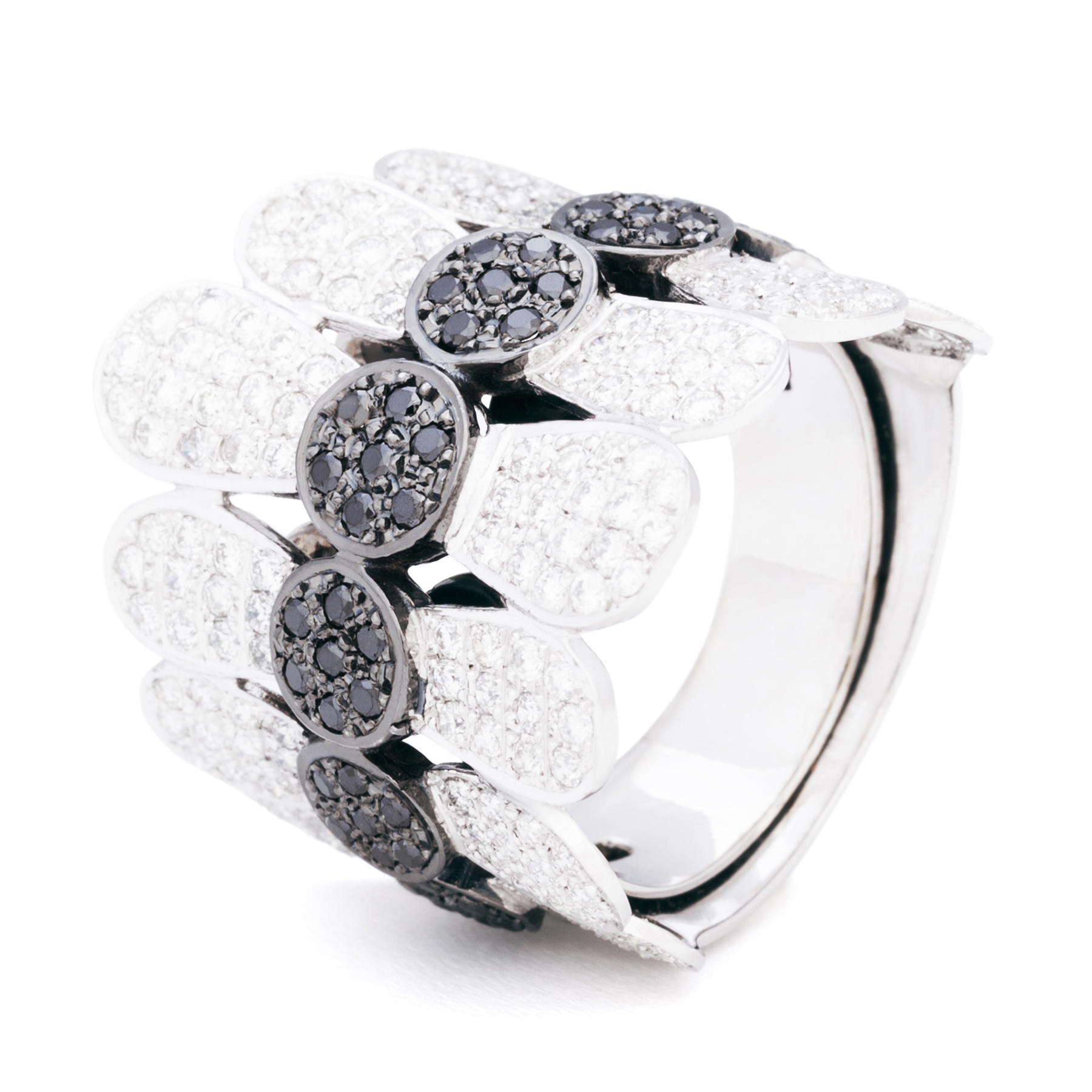 Anillo de oro blanco de 1ª Ley por pétalos de pavé de diamantes HVS y centros de pavé de diamantes negros.